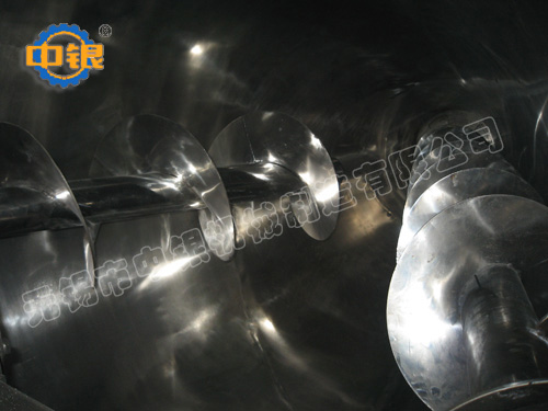 雙螺旋錐形混合機筒內兩只非對稱螺旋自轉將物料向上提升,轉臂慢速公轉運動;使螺旋外的物料,不同程度進入螺柱,從而達到全圓周方位物料的不斷更新擴散,被提到上部的兩股物料再向中心凹穴匯合,形成一股向下的物料流,補充了底部的空缺,從而形成對流循環的三重混合效果;標準型錐形螺旋混合機有兩根攪拌螺旋,實際應用中根據設備規格大小可以采用單(一根長螺旋)、雙(長短各一兩根不對稱螺旋)、三(兩短一長對稱布置)根螺旋;理論上攪拌螺旋越多,混合效果越好;設備一般采用梅花狀“錯位閥”,此閥與長螺旋底部貼合緊密,有效減少混合死角,驅動形式有手動和氣動可選;根據用戶需要,也可加裝蝶閥、球閥、星形卸料器、邊出料等。